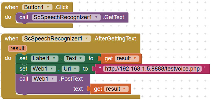 Kliknu na button, řeknu slovo,google asistent to převede do textu, vypiše se to do labelu a odešle na server.