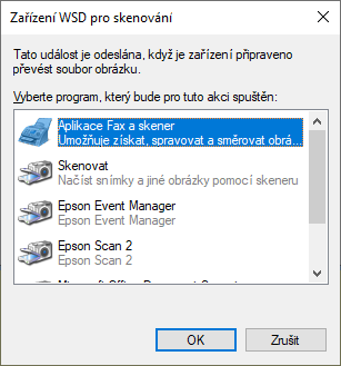 A když dám na tiskárně výběr skenování ne "Počítač", ale "Počítač (WSD)", tak se tam můj PC objeví (ale zase ne manželky, která jej má teď zapnutý!) a při jeho výběru mi v PC vyskočí okno