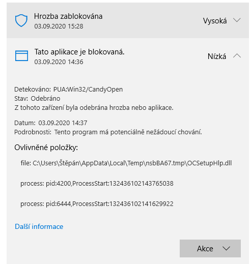 To první je reklamní modul OpenCandy nebo prostě modul, který se někdy přikládá k programům a obvykle je detekován jako PUA (