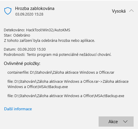 Předpokládám, že je to program na zálohu aktivace a obsahuje i kms aktivátor, to tipuju podle názvu a podle toho jak jej detekuje defender.