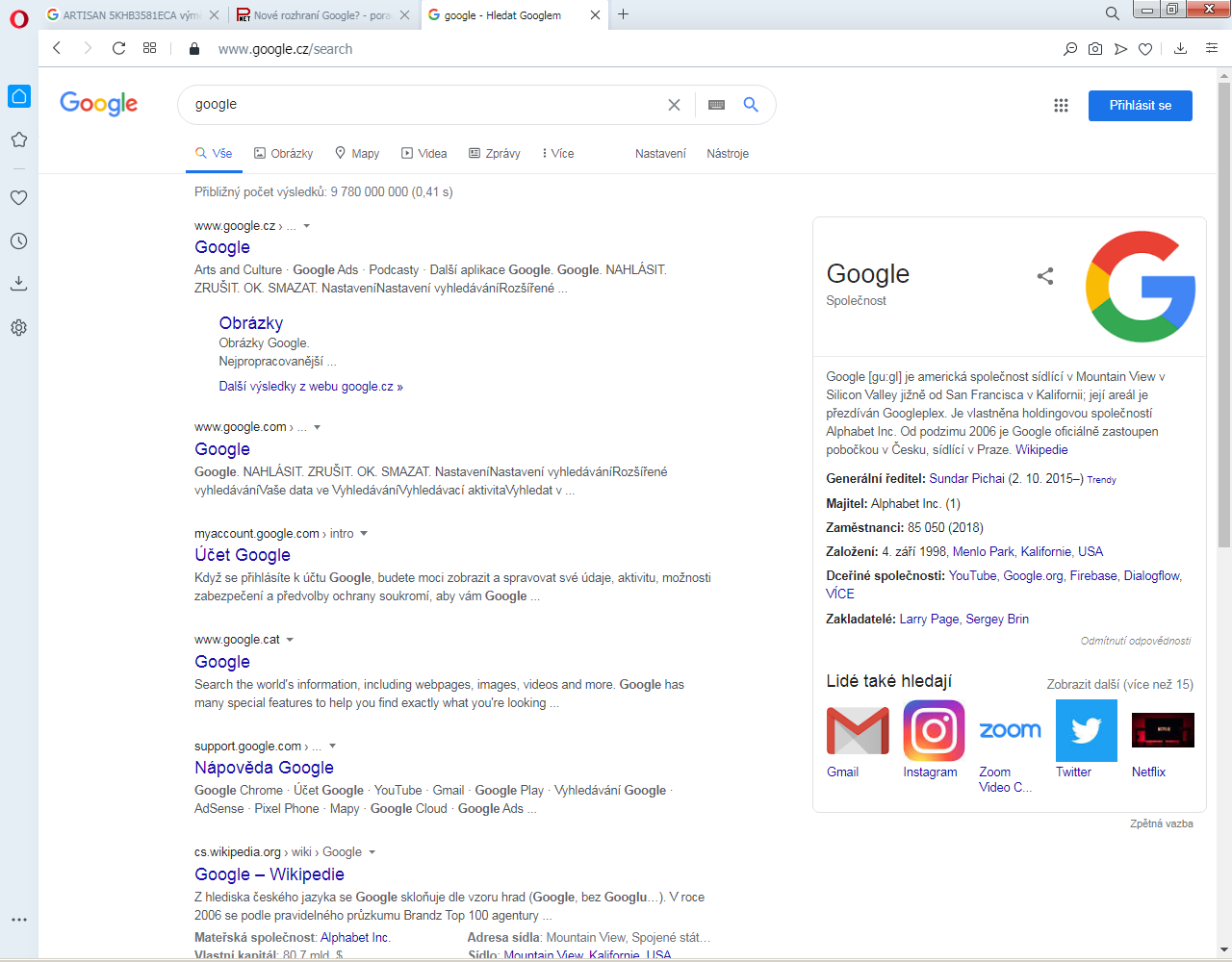 Zdravím, už několik dní mám nový vzhled internetové stránky Google (viz. foto - Informace jsou uprostřed stránky, né na levém okraji jako vždy v minulosti.) Za prvé mne tento vzhled rozčiluje, jelikož jsem byl zvyklí na jiný a jsou tu nesmyslně zobrazeny obrázky apod. Za druhé je načítání strašně pomalé, čekám 5 sec. než to vůbec něco vyhledá. Jelikož jsem se snažil tuto změnu najít, nic jsem nenašel , ani žádné stížnosti na to. Tak je dost možné, že to tak mám jen já ? Má někdo taky tak ? Díky! :)