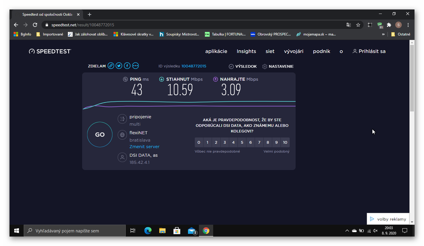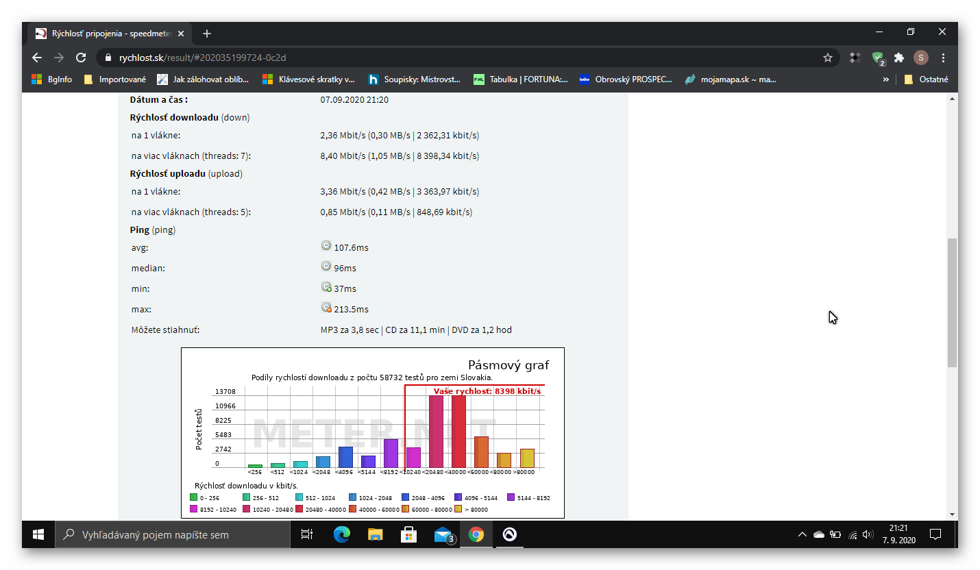 Ďakujem za odpovede,no ja som to pochopil tak a čo som aj našiel na nete.Že to na viac vláknach sa myslí,že naraz sťahujem príklad z uloz.to,fastshare,hellspy.Alebo mám Internet download manager,že vraj tento sťahovač zrýchly rýchlosť sťahovania až 5 násobne.No ono sa to myslí tak,ak som to správne pochopil,že sťahujem nejaký film napr.z fastshare cez IDM,to sťahovanie toho filmu príklad veľkosť 4,5 giga sa v tom IDM rozdelí ako keby na viac vlakien,ak som to správne napísal napr. na 8 vlákien tak tá rýchlosť je väčšia rovnaká?Už som sa stratil.Ved to je v podstate to isté či ten film budem sťahovať klasika cez Google,alebo cez nejaký Download manager.Sa to stiahne za rovnaký čas.Príklad nameraná rýchlosť download cez speedtest 10,59 Mbps - bude mi zhruba sťahovať 1,3 Mb/s(Google).No a to isté aj cez Internet download manager,len tam sa to rozdelí na tie vlákna,ale to je to isté či?Ps obr.čo som nameral dnes rýchlosť netu.Používam väčšinou tento speedtest.net.Pekný večer