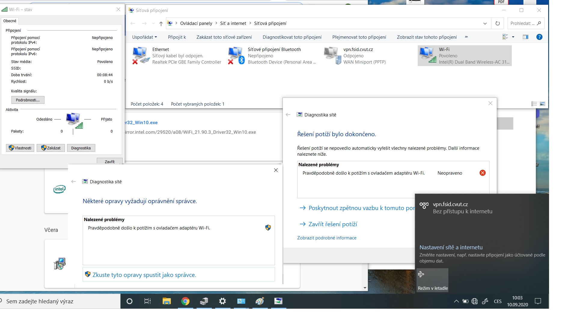 Přikládám obrázek s problémem. Wi-Fi to píše, že je připojená, avšak ji to v hledání vůbec nenajde a připojení k internetu bez kabelu samozřejmě nefunguje.