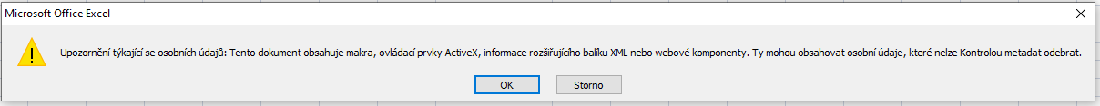 "Upozornění týkající se osobních údajů: Tento dokument obsahuje makra, ovládací prvky ActiveX, informace rozšiřujícího balíku XML nebo webové komponenty. Ty mohou obsahovat osobní údaje, které nelze Kontrolou metadat odebrat."