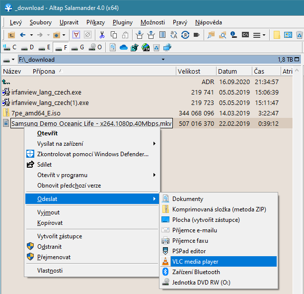 - zástupce vlc (a jiných přehrávačů) přidat s parametrem "%1" do "sendto" u svého profilu a spouštět pravým myšem, to zabere vždy.