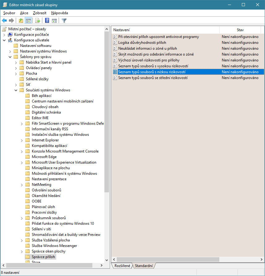 User Config.\Administrative Templates\Windows Components\Attachment Manager\LowRisk filetypes - najít to v češtině byl potrat