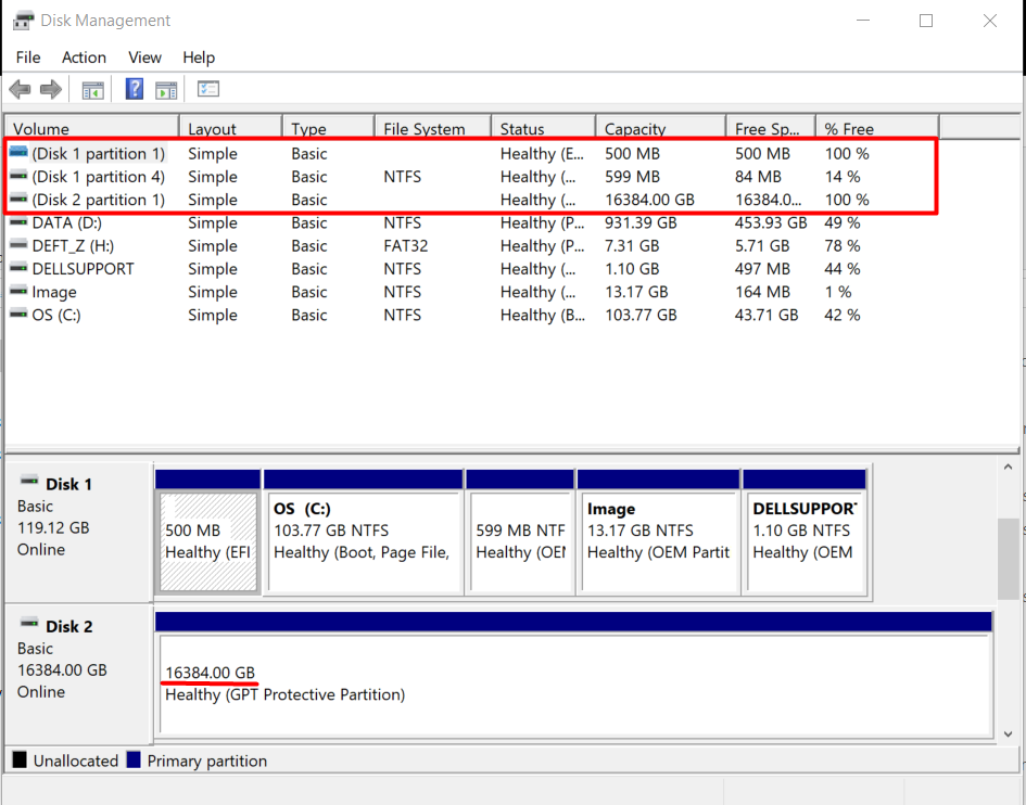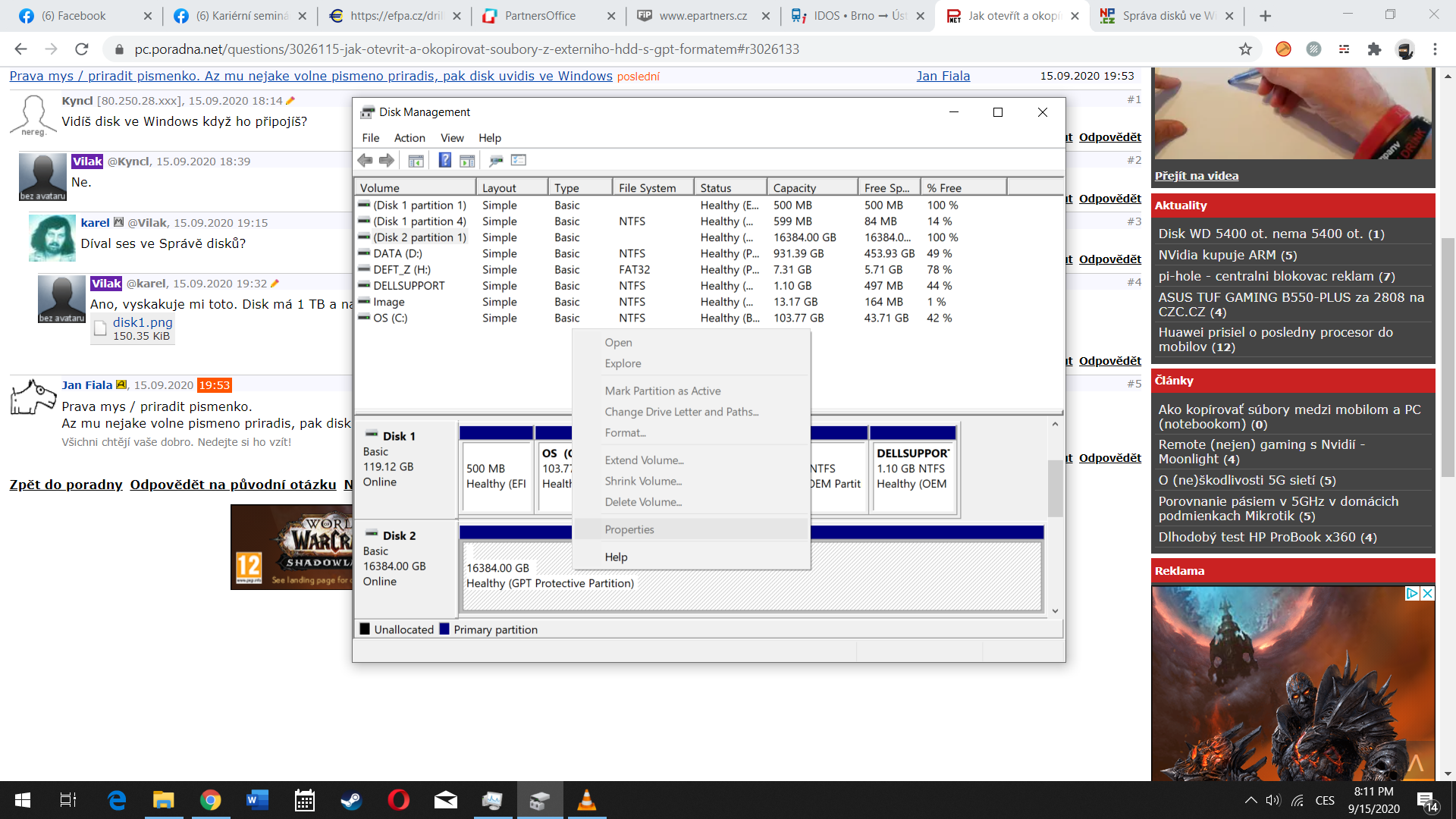 Nesmyslná velikost, 100% volného místa, tj.data správa disků žádná nevidí.Zkus ho připojit k jinému PC ne přes USB redukci, ale rovnou SATA kabelem+ napájecí kabel.Případně zkusit MiniTool Partition Wizard, jak to uvidí on.Ten umí i převod GPT na MBR bez ztráty dat, i když u tohoto problému to může být trochu riziko.