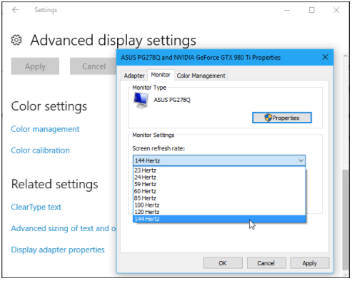 Nastavení → Systém → Displej → Pokročilé nastavení displeje → Vlastnosti grafického adaptéru → 144Hz + apply.