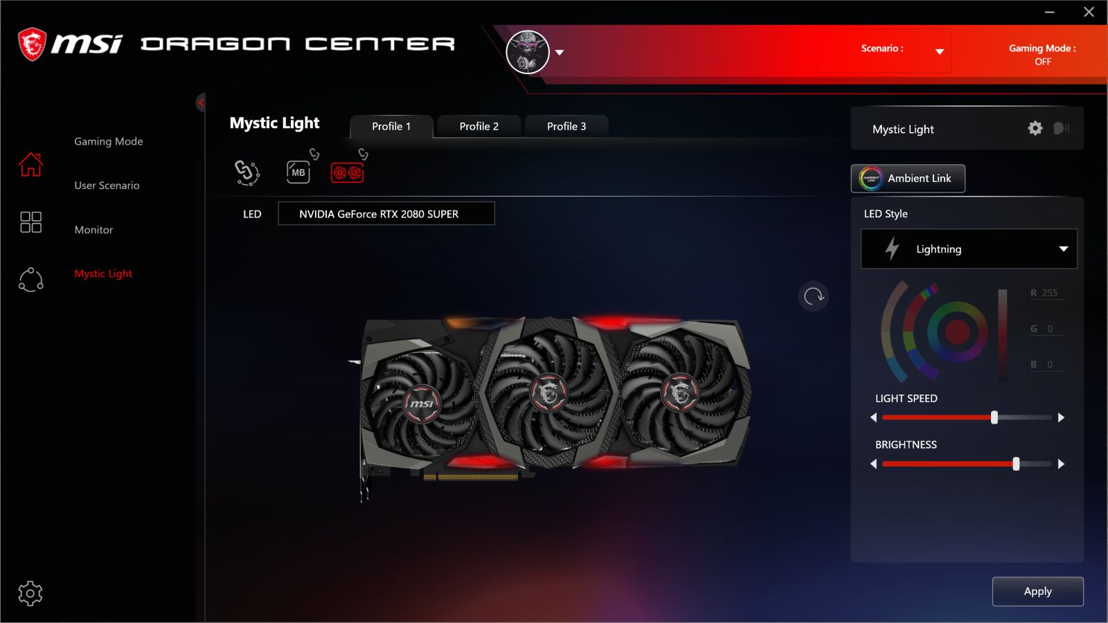 Co vím tak tu původní aplikaci Mystic Light už přímo neaktualizují a třeba u Super karet ani nefunguje, možná bych zkusil Dragon Center, ale je to neskutečná sračka a je tam toho strašně moc (nějaký gaming mody, přetaktování, akcelerátor netu,...), instaluje se už jako UWP aplikace z Windows Store, což jako chápu, že se to snažili sjednotit, ale klidně se tím programem dá dost snížit výkon, nešahat na profily jinak je to na přeinstal