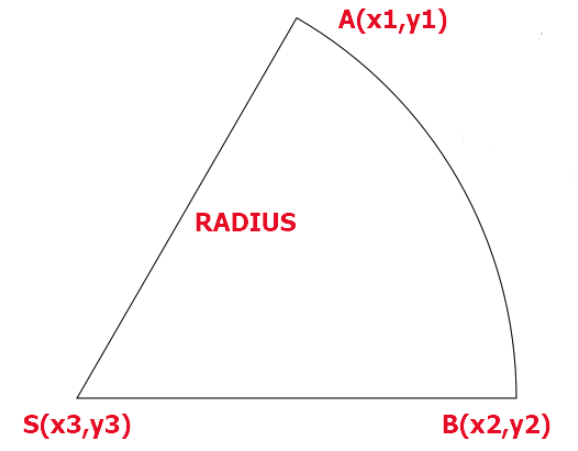 Mám tento obrazec, u kterého vím souřadnice bodů A, B, S a radius.