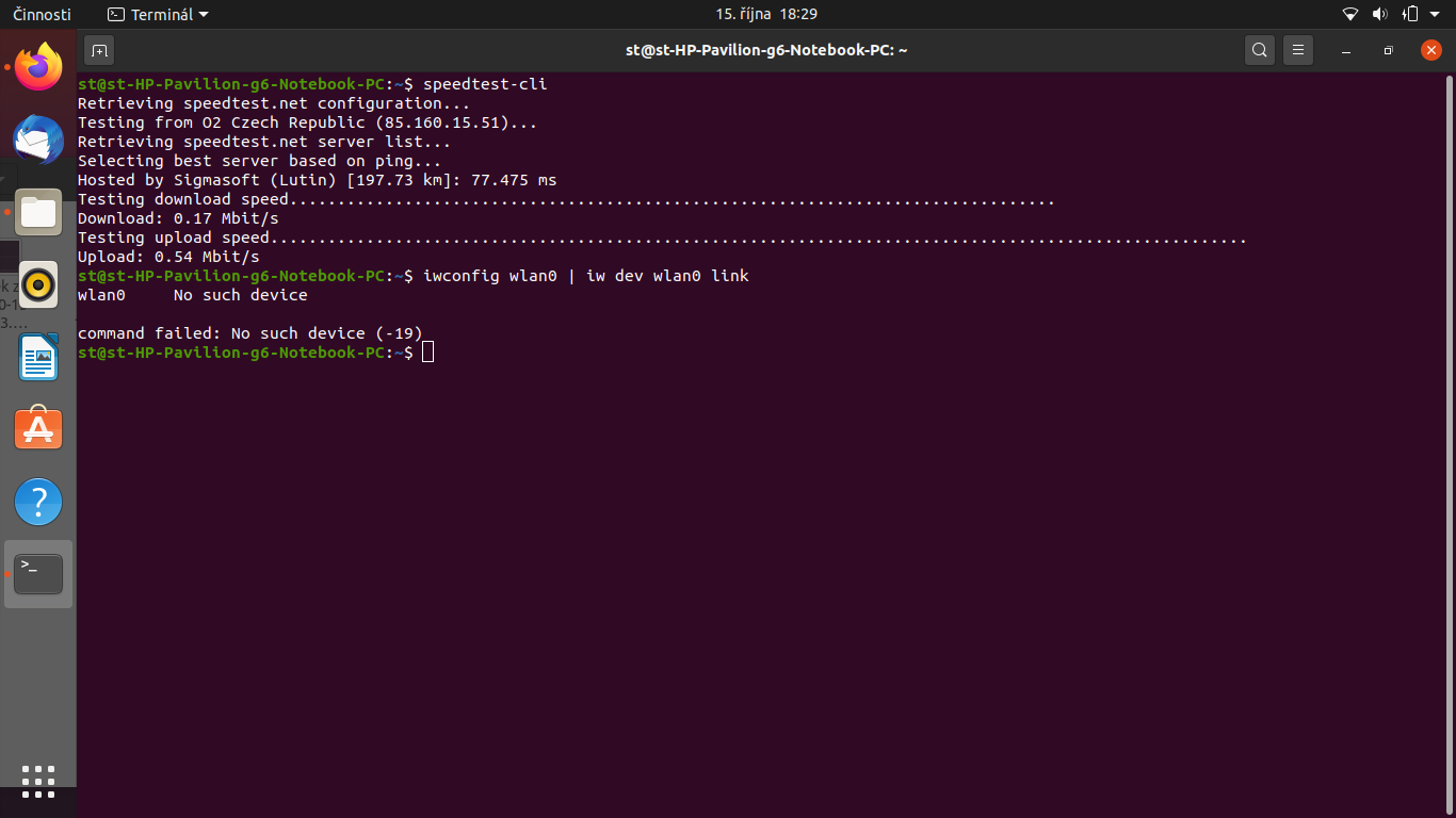Musis jeste napsat speedtest-cli aby se spustil test. Pak se podivej, jky mas Bit Rate : iwconfig w…