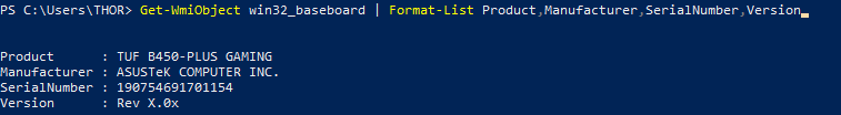 Get-WmiObject win32_baseboard | Format-List Product,Manufacturer,SerialNumber,Version,Model