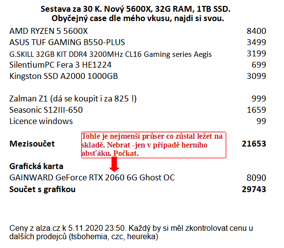Dobrý den, prosím o doporučení herní sestavy cca kolem 30 000,-Kč. Pouze bednu, monitor mám. Použití PC pracovní (textové dokumenty) a hry, železniční simulátory. Transport Fever 2, Trainz 2019,...atd. Pro chod těchto her je nejdůležitější plynulost, která se s mým aktuálním PC, tím jak se v průběhu hry stále přibaluje více a více objektů začíná sekat.
