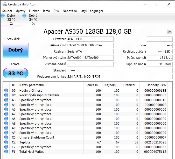 máš sice ssd, ale třeba crystaldiskinfo vyjede nějaký zajímavý údaj.