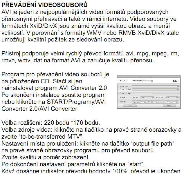 Já mám AVI converter nainstalovaný, ale když zadám vše co mám (krom tohoto: "klikněte na tlačítko na pravé straně obrazovky a zvolte "to-be-transferred MTV" - to nechápu co má být) ...a konvertování mi nejede. U "Progress" má nabíhat kolik procent je hotovo...neukazuje se nic, ale program přitom tvrdí, že převádí.