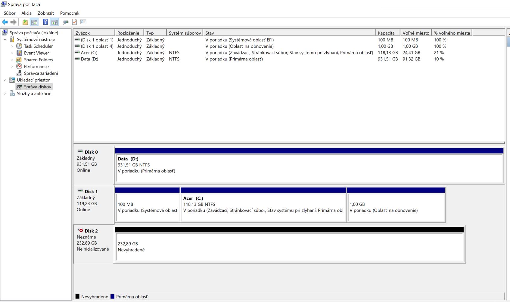 Ked dam prave tlacitko priamo na tom disk2 tak mam na vyber Konvertovat na dynamicky disk, Konvertovat na disk MBR, vlastnosti alebo pomocnik. Ked dam prave tlacitko na 232GB navyhradene tak tam mam Novy jednoduchy zvazok, vlastnosti alebo pomocnik.