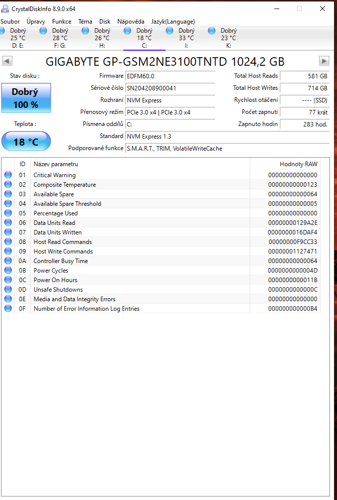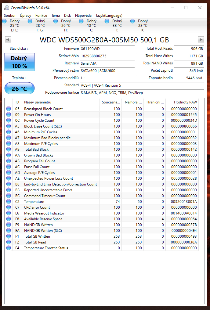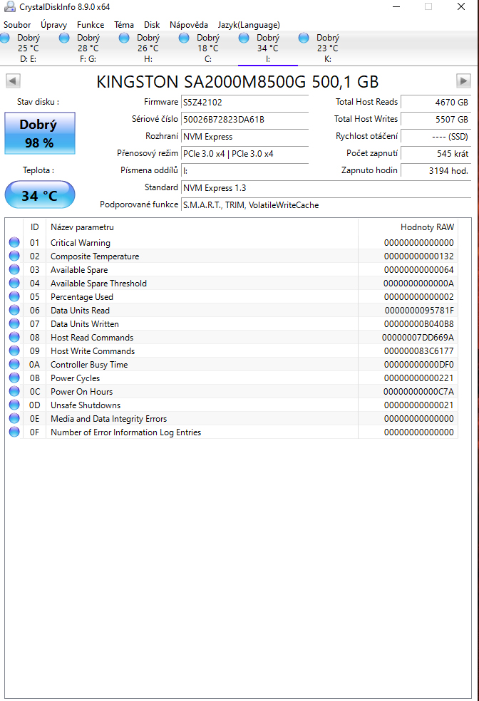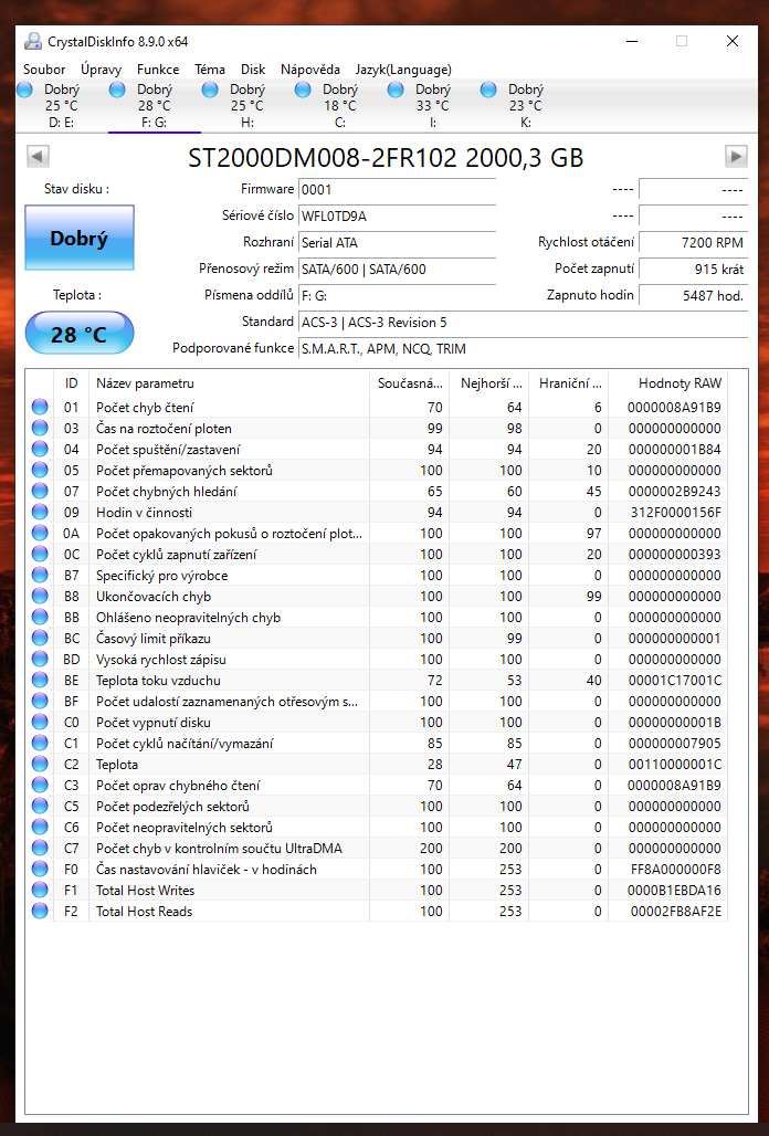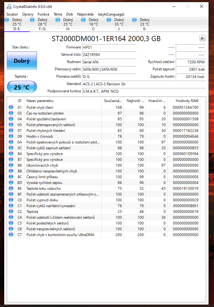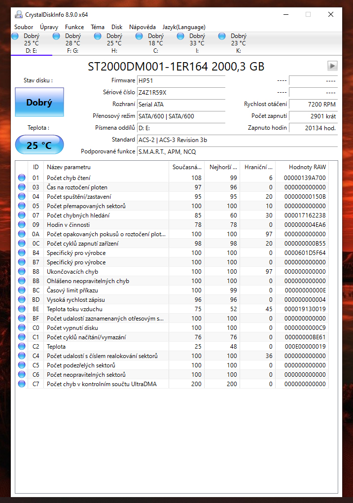 ano ano, kupovane jednotlive na Alze. Pameti jsem uz zkousel jak v defaultu tak na profile 1. ja vim, ze je to asi blbost, ale opravdu ten pocitac jel skoro rok bez jedine chybicky, dokud jsem nevymenil ten monitor. myslis ze by to mohlo byt tim? ten xbox jsem vyradil z provozu pres program OOAPB, tak uvidime. disky jsem projel pres ten program CrystalDiskInfo, nejake chyby to hlasi, ale problem je ze pc padl i kdyz jsem vsechny disky odpojil, takze tam bych pricinu nevidel. (prikladam screeny) kazdopadne hrozne moc ti dekuji za cas. stale premyslim, ze pc jel dokonale, zadne zmeny za ten rok nebyly, az potom ten monitor a od te doby.... uz to vidim jen na tu grafiku, ale proc... to je otazka. vcera jsem udelal testy a teploty v max zatezi gpu 70 a cpu 68, chipset 66 a bez padu, proste jsou ty pady nahodne... jeste me napadla jedna vec... myslis ze by tohle mohlo delat kolisani napeti v siti? to je asi blbost co?