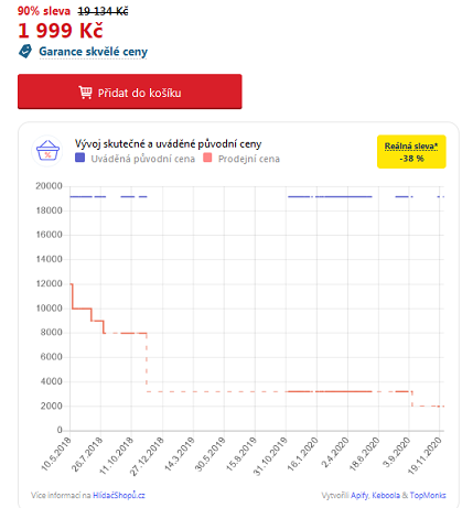 On je problém v tom, že tu původní cenu 19134 Kč u CZC nikdy nebo posledních 2,5 roku neměli, vždy nižší a ta škrtlá byla v podstatě podvod.Podobně fungují i další obchody, třeba Mounfield, kde škrtlé ceny neplatí nikdy a slouží jen pro akce typu Vše za třetinu apod.Takže tuto kartu zlevnili z minulé ceny 3199 Kč,platné už od 7.11.2019, jen o 38%.