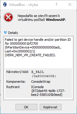 Chtěl jsem přes VirtualBox nainstalovat Windows XP. Avšak, při spuštění instalačky to zahlásí chybu.