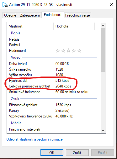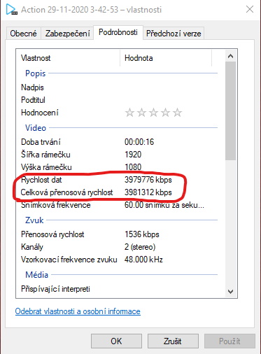 Měl bych dotaz, jaký použít program pro komprimaci videa natočeného programem "Mirillis Action!" používám k natáčení rozlišení 1080p formát AVI: (dejme př; test plochy 15/16s (zvuku i miku) - poté po vypnutí nahrávání vám ukážu obrovskou rychlost dat. (screeny) - (Nikde v natáčecím programu tato volba ohledně snížení rychlosti dat, není)