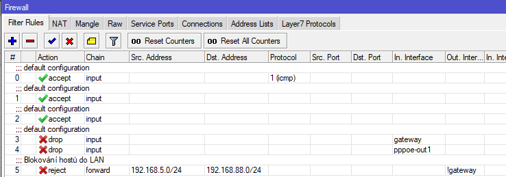 Je u nás vnučka a zprovoznil jsem jí jeden náš starší/záložní PC (s vlastním omezeným účtem) a chci tomuto účtu za všech okolností zabránit v přístupu do ostatních PC v síti. IP tohoto PC je 192.168.88.204, IP těch ostatních PC např. ...201, 202, 203. Zkoušel jsem použít reject jako u wifi, source 192.168.88.204 (ten nový PC), jako destination jsem zkoušel zadávat 192.168.88.201 (konkrétní PC), 192.168.88.0/24 (celá LAN), !192.168.88.204 (vše kromě jejího PC), jako outgoing interface !gateway... ale z toho jejího PC se prostě pořád dokážu třeba na svůj PC dostat (s uvedením hesla).