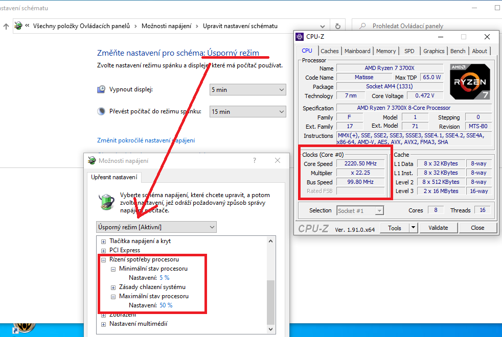 Nataktovaný procesor jsem vrátil do původní podoby a podíval se na to řízení spotřeby. Měl jsem tam ryzen Balanced, u kterého byl minimální stav procesoru 90%. Přehodil jsem to na úsporný režim, potom i na rovnováhu a díval se na ty minimální stavy procesoru, které měly 5% a ani po restartu se nic nezměnilo.