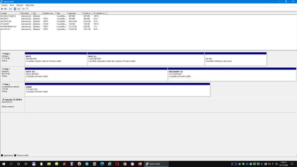 Správa disků vypadá takto, vše v pořádku, akorát flashka LEXAR nemá písmeno disku.