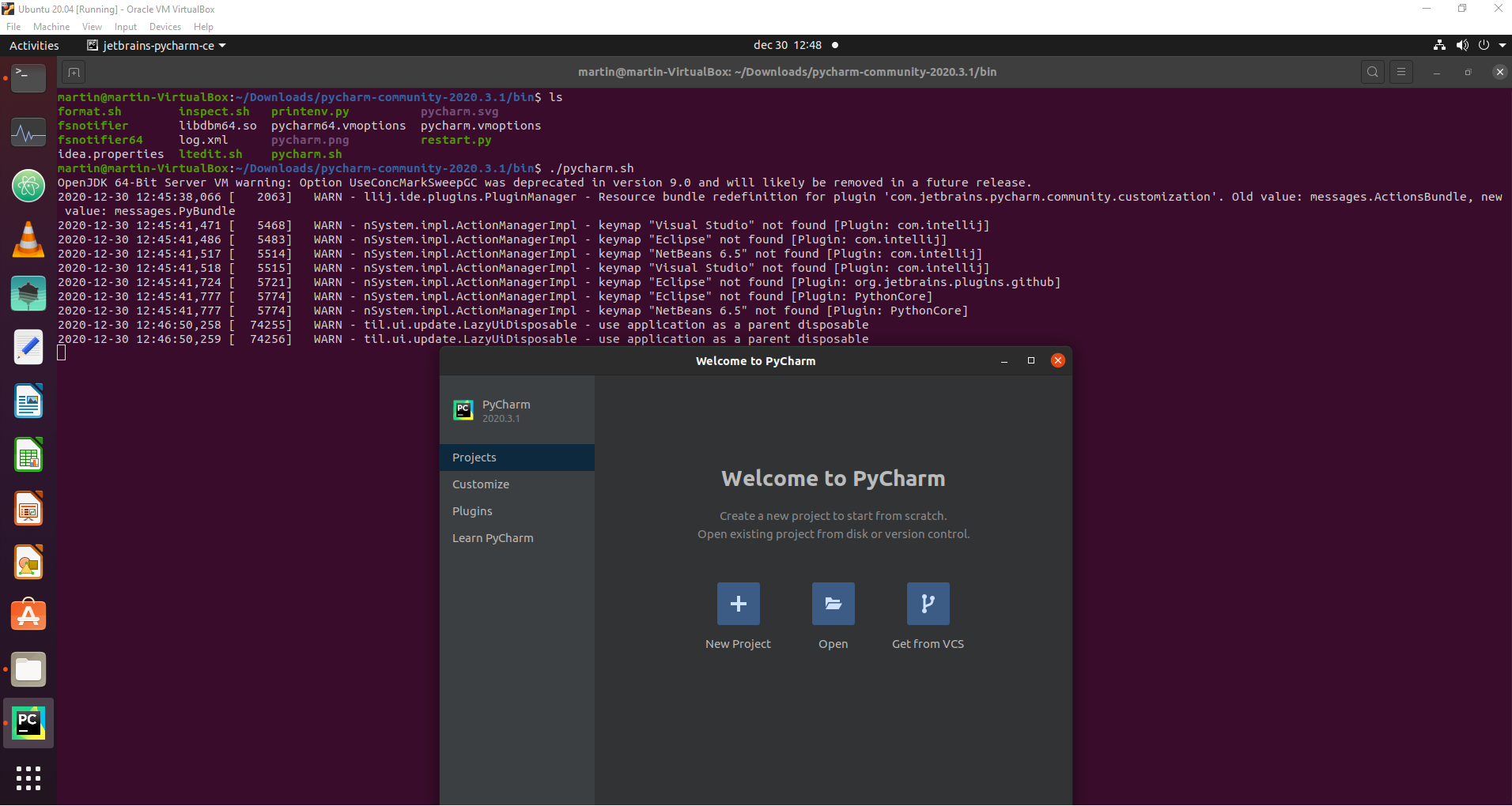 vo VirtualBoxe mam ubuntu 20.04 a chcem tam nainstalovat program PyCharm. Stiahol som si community verziu v archive, kt. som rozbalil do tej istej zložky. Potom som postupoval podla navodoov na internete. Všetko som urobil rovnako (vid screen) no mne sa po spusteni ./pycharm.sh cely program otvori ako by uz bol nainstalovaný. To by bolo OK, len ho neviem v menu najsť a spustat to takto cez terminal mi príde dost otravne. Pri spusteni toho prikazu mi to vyhodilo aj nejaké warningy, kt. nerozumiem. Viete mi z týmto pomoct, lebo normálne po spustení .sh suboru sa ma akoby spustil instalator. No mne sa namiesto toho otvorí program.