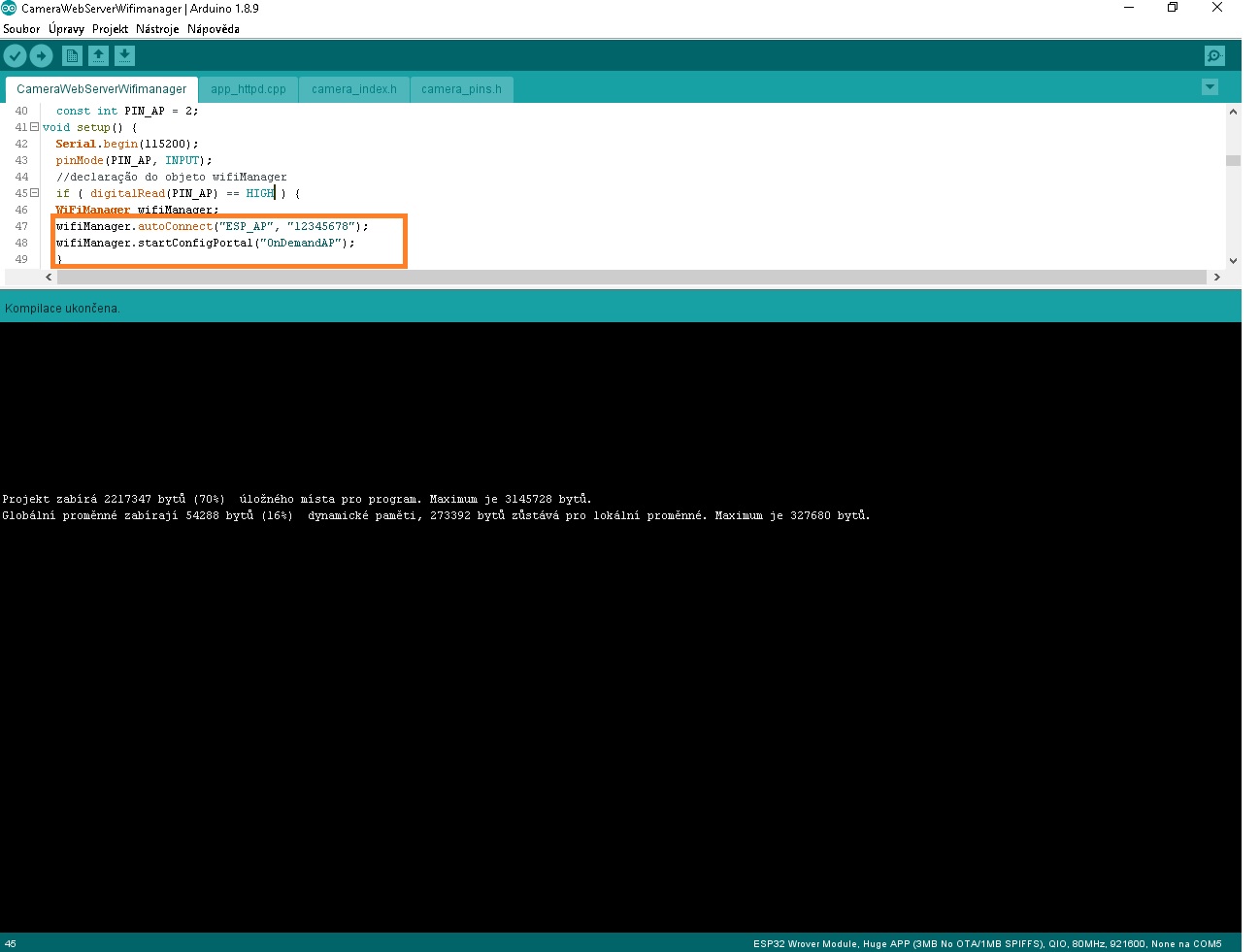 Nebudu se sebe dělat borce ale včera jsem si na to vzpomněl v těch chybách při překladu tam je celá cesta k souborům (je to opraveno).Na uvedeném odkazu je příklad ESP32 ale to chci pro ESP32 CAM tam je rozmístění pinu a jejich názvy jiné , tak se ptám na piny jestli třeba u ESP32 CAM nemusí povolit nebo nastavit periferie pokud periferie používají stejné piny a tak dál .Další nejasnost je taková vis příloha kompilátor na to nic neříká já chci použít jen funkci wifiManager.startConfigPortal("OnDemandAP"); proč není zbarvená za tečkou jak wifiManager.autoConnect("ESP_AP", "12345678"); ? díky