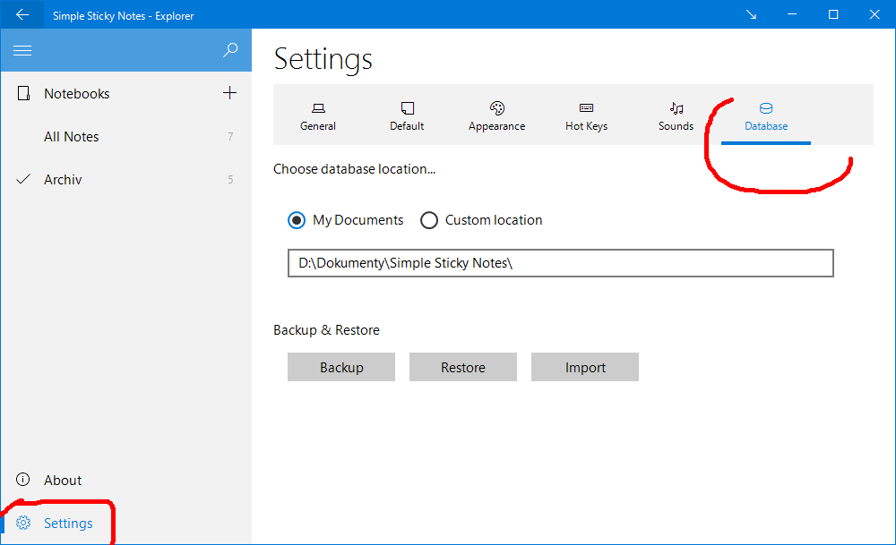 Simple Sticky Notes standardně ukládá poznámky do SQLite databáze s názvem Notes.db umístěné ve složce Dokumenty\Simple Sticky Notes.