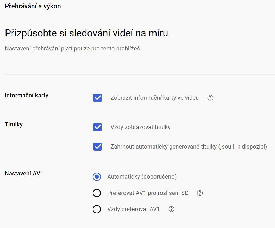 Já mám v Nastavení - Přehrávání a výkon - zaškrtnuto "Vždy zobrazovat titulky" i "Zahrnout automaticky generované titulky (jsou-li k dispozici)" a přesto vždy musím u každého videa v Nastavení zvolit Titulky - Automatický překlad a tam čeština. Bez toho jdou titulky vždy v původním jazyce.