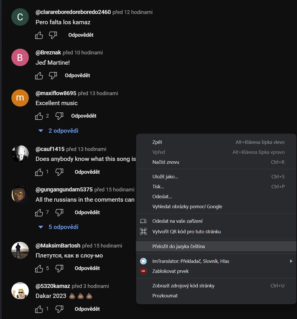 V Chrome pravý klik na komentářích a přeložit do češtiny. Přeloží to všechno i když jsou jednotlivé komentáře původně v různých jazycích.