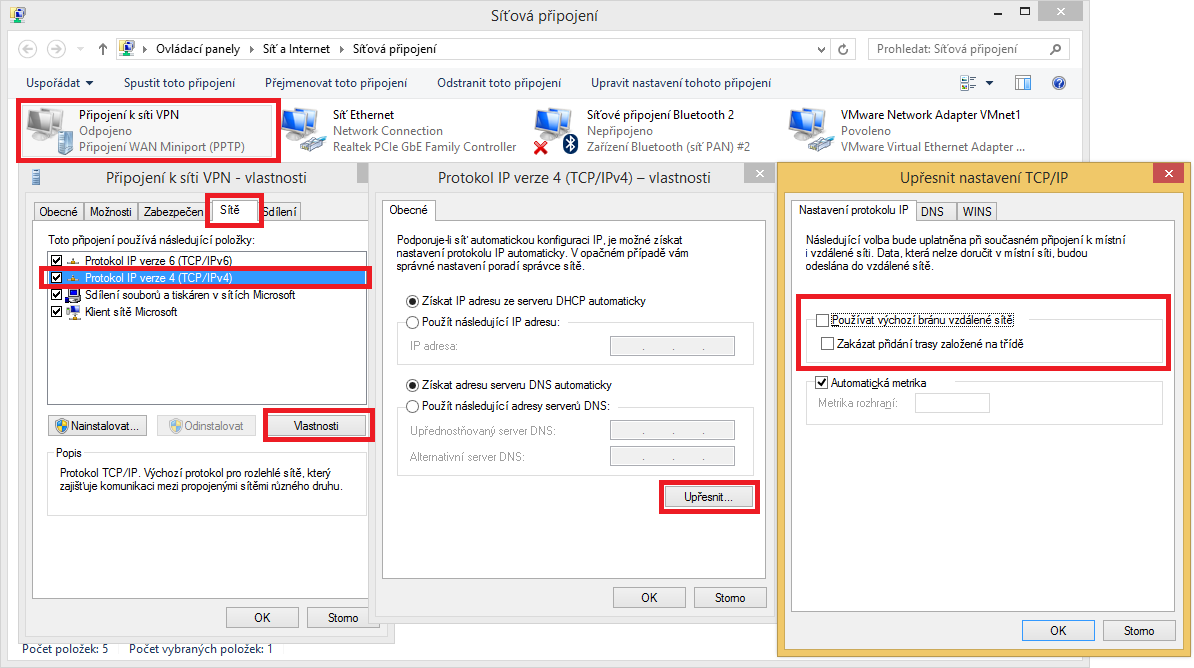 Připojení k VPN bez směrování místního provozu přes internetovou přípojku vzdálené sítě