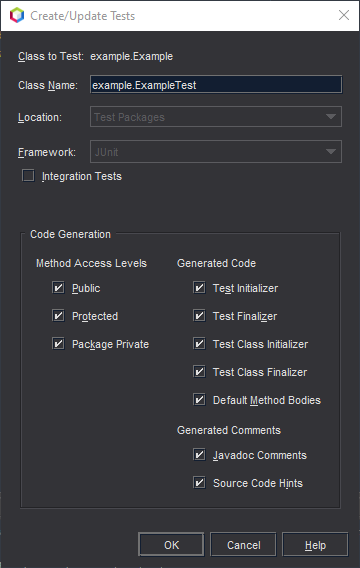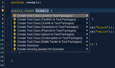 Následně jsem přes žárovku na řádku třídy vytvořil JUnit Test