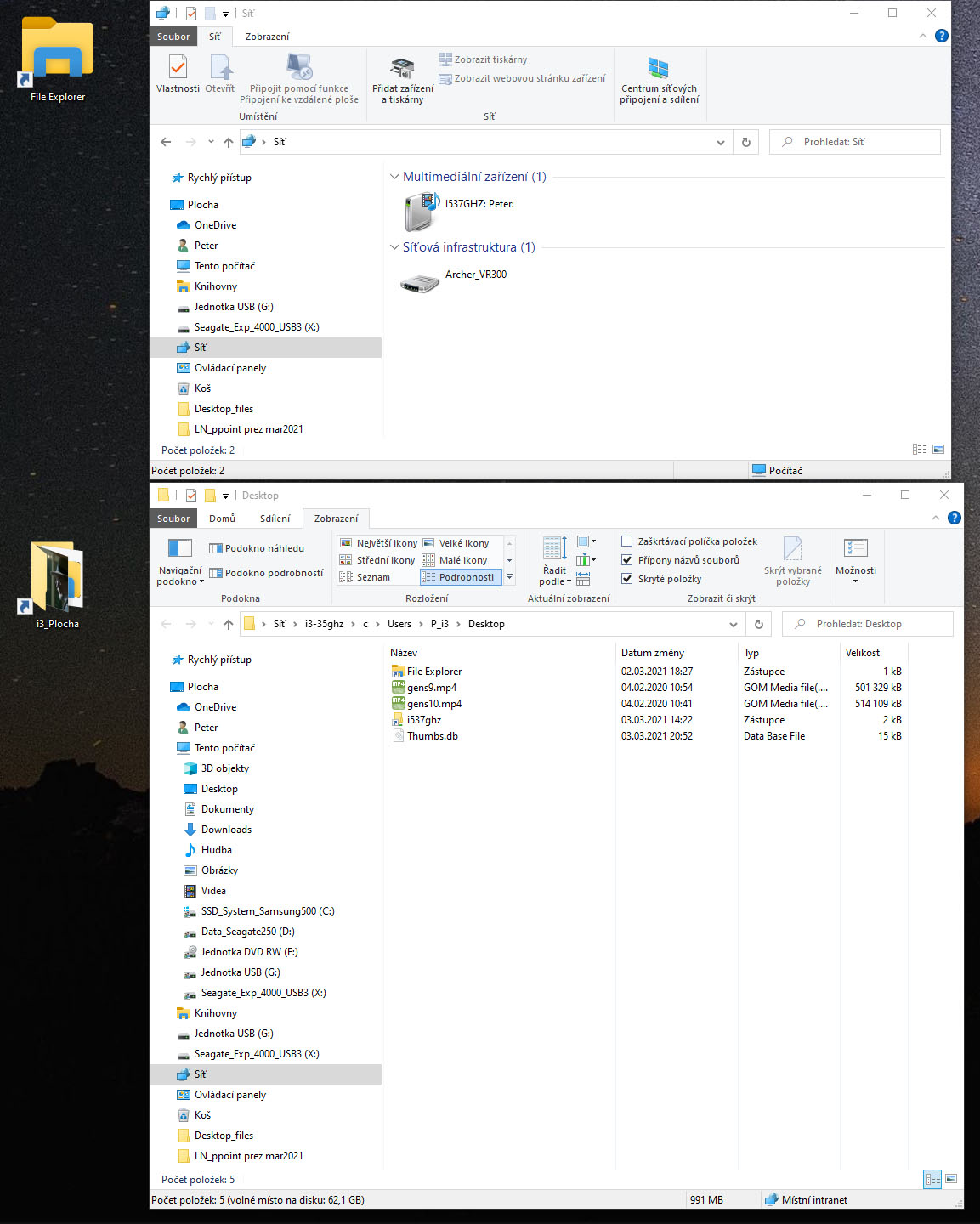 Ve FileExploreru/Síť jednoho pc i5 pripojené pc i3 není vidět, i když přes zástupce na něj to jde. Obráceně to je viditelné.