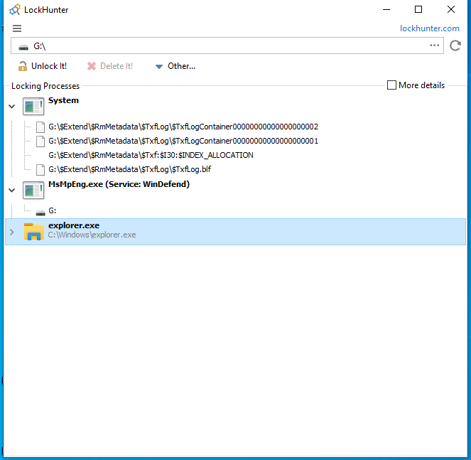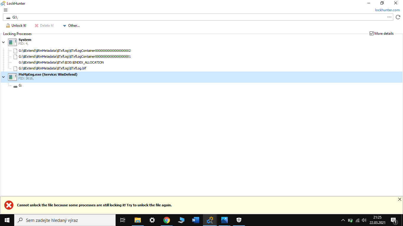 Ano, udělal jsem to 3x a stále nic. Program nijak nespouštím, nainstaloval jsem ho, najel na disk a pravým kliknutím "What's locking this folder?" (stejně jako je to zde - https://lockhunter.com/ ).
