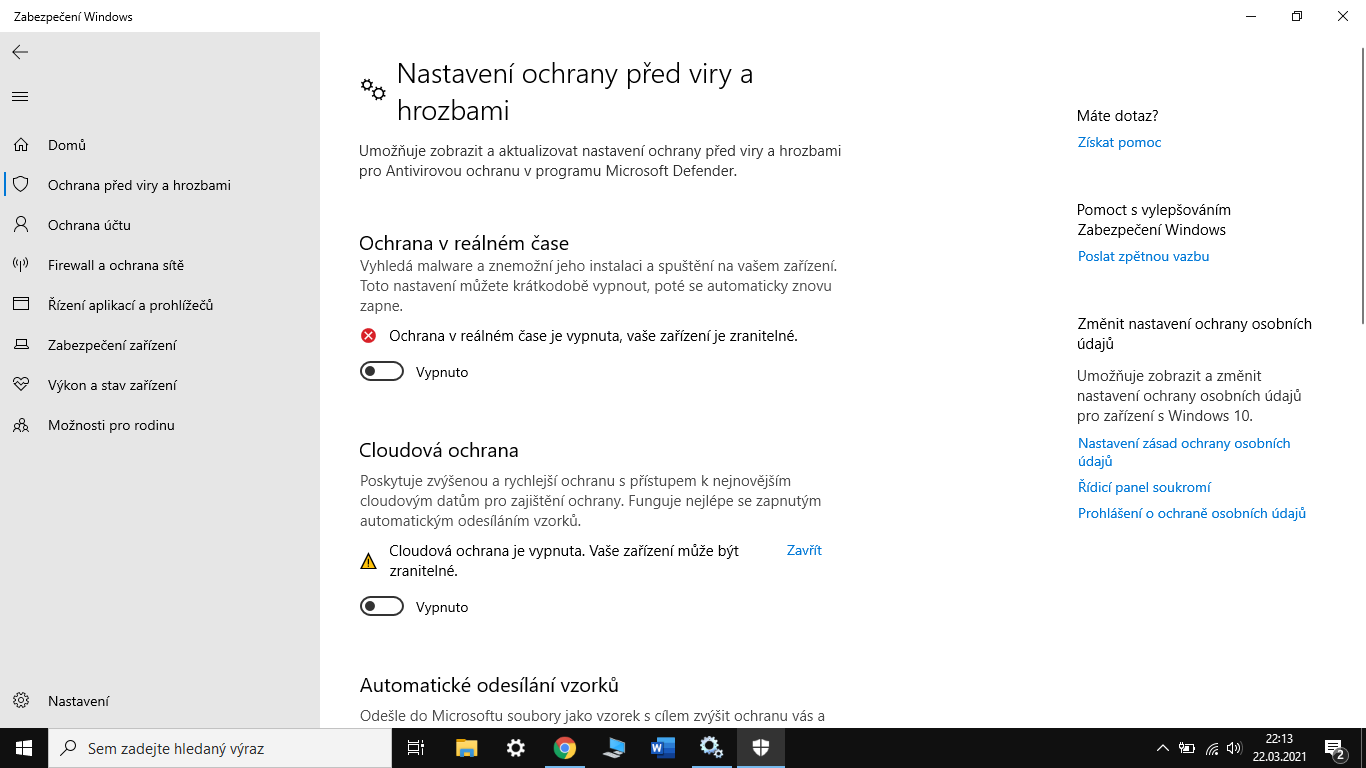 Ano, Defender jsem dočasně vypnul a taky nerozumím tomu, proč běží - vypínal jsem ho tím způsobem, že jsem vypnul a) ochranu v reálném čase a b) cloudová ochrana. Vypínám ho tedy špatně?