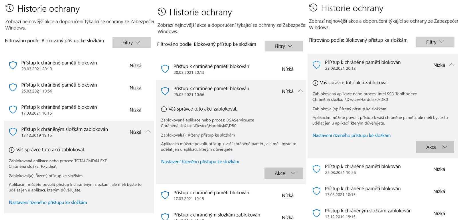 Poslední dobou se mi opakovaně zobrazují hlášení defenderu o zablokování přístupu. Viz příloha. Nevím proč blokuje přístup tooboxu k SSD, ani proč se mu už v prosinci 2019 nelíbil přístup do složky videa z TC.