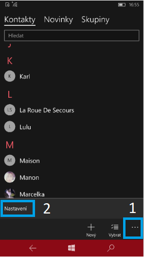 Kontaktů v telefonu mám přes 200. Hledal jsem možnost v telefonu kopírovat kontakty, ale ani to jsem nenašel. Kontakt přidat lze, ale jen jednotlivě. Telefon se dá zálohovat do ONE drive, ale jen fotky a kalendář, víc se tam nekopíruje.