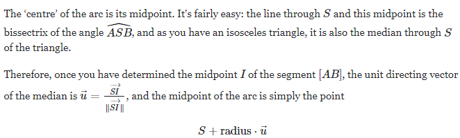 Znám souřadnice bodů A, B, S a radius. A potřebuji vypočítat střed oblouku (midpoint)