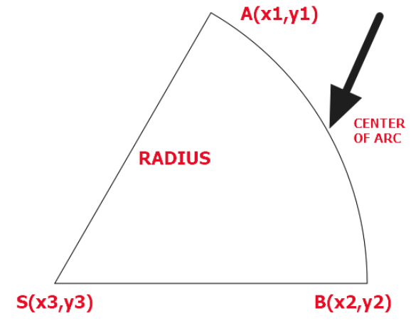 Znám souřadnice bodů A, B, S a radius. A potřebuji vypočítat střed oblouku (midpoint)