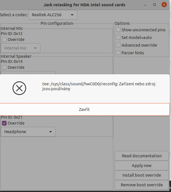 karta 0: PCH [HDA Intel PCH], zařízení 0: ALC256 Analog [ALC256 Analog]