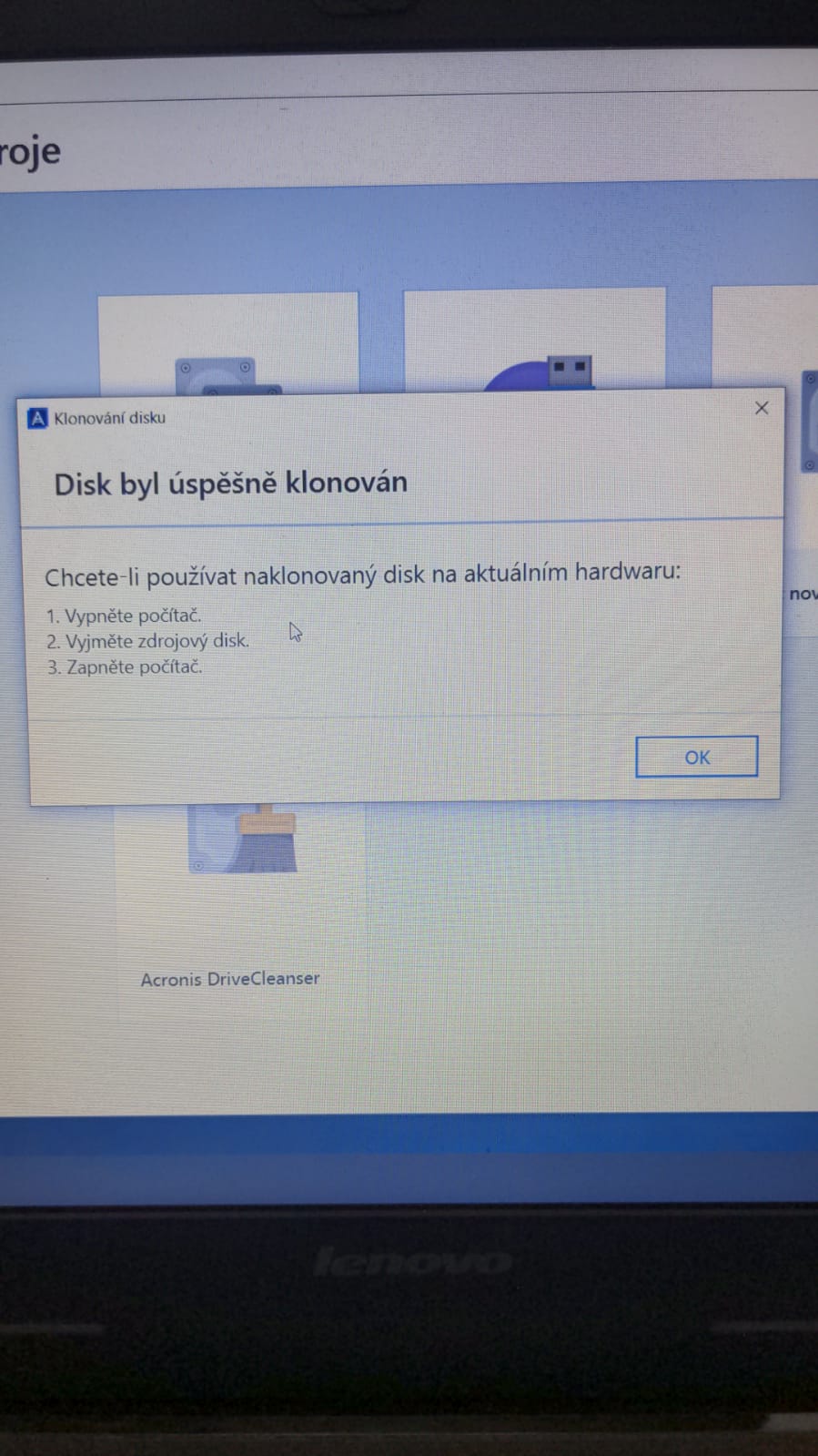 naklonoval jsem cely disk HDD 1TB na nový disk HD WD Blue 3D NAND SSD disk 1TB, interní, 2,5", SATA3. Klonování proběhlo přes Acronis true image, který jsem si stáhl na stránkách WD. Nový disk jsem měl připojen přes externí rámeček sata adaptér. Po dokončení klonování to napsalo, že vše proběhlo ok a pak jsem vyndal starý disk z notebooku a dal tam ten nový a při zapnutí se mi w10 nespustí. Objeví se pouze modré okno s nápisem probíhá oprava chyb na disku a až to dojede tak to skočí do windows boot manageru.