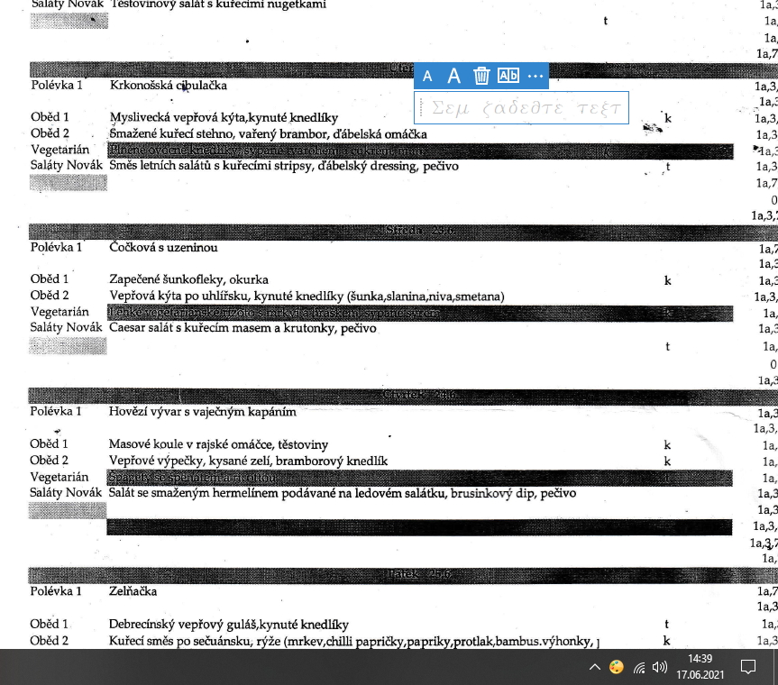 Podle těch fleků je to nějaký naskenovaný (a navíc značně jetý) jídelák. Tedy to vlastně není PDF dokument, ale sken uložený ve formátu PDF. Navíc PDF dokumenty se obecně nehodí pro úpravu, naopak jsou využívány zejména proto, že se nemění a na každém počítači vypadají stejně.