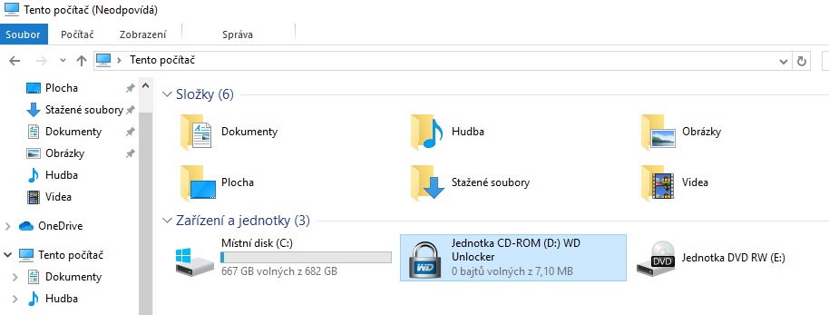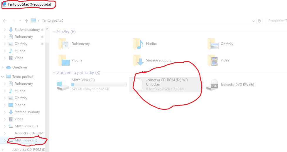 1) Zkusil jsem micro USB - to samé - objevil se disk D: WD Unlocker, napsalo to úspěšně odemčeno a dokonce se mi vytvořil po odemčení onen virtuální disk, kde jsou ta uložená data (v tomto případě disk F:), ale pak to zase zamrzlo, když jsem chtěl disk F otevřít (viz příloha: pic 3). Podruhé už mi to zamrzlo rovnou při snaze otevřít disk D:, potřetí jsem při otevření disku D: dostal hlášku "Aplikace nebyla nalezena". Chová se to stejně jako s originálním kabelem.