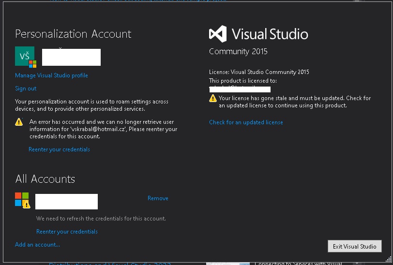 Visual Studio Community 2015 - vyžaduje aktualizaci licence a účtu