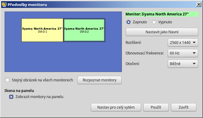 Přesnější postup takto z hlavy nedám, mám před sebou teď jen dva počítače s linuxem, kde to sice je principiálně stejné, ale přecejenom trochu jiné než ve windows (tlačítko "rozpoznat monitory" se bude jmenovat jinak). Stačí ale klepnout pravou myší na plochu a dát možnosti zobrazení nebo rozlišení zobrazení nebo jak se to jmenuje a pak je postup už intuitivní.