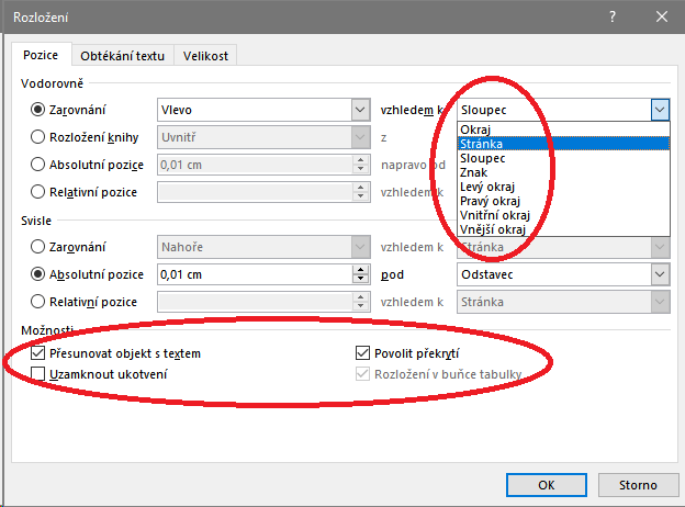 Ve vlastnostech obrázku máš spoustu možností, vůči čemu obrázek vodorovně nebo svisle fixovat a jak se má obrázek chovat vůči textu: