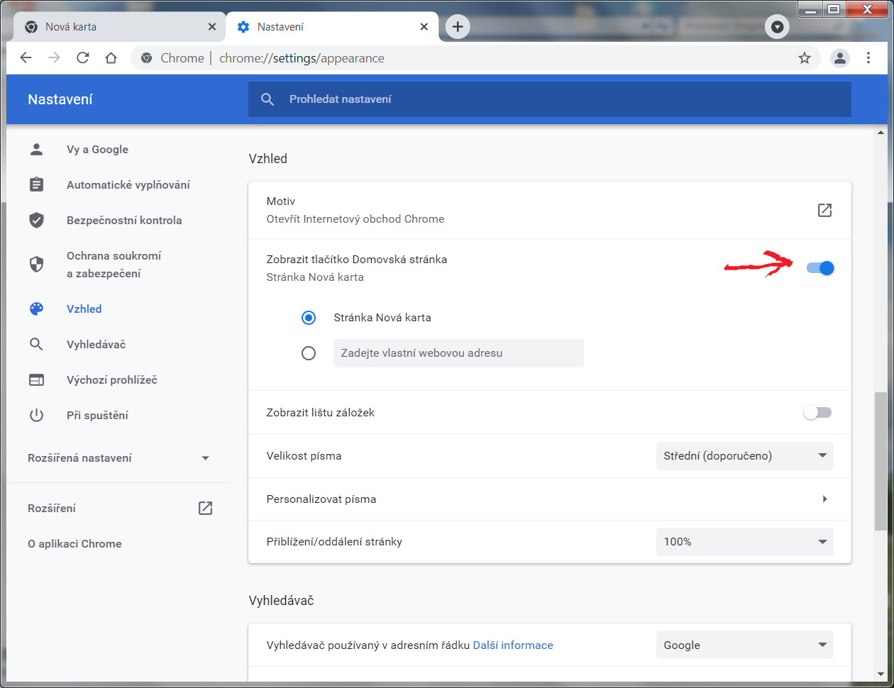 | Zkus to přes chrome://settings/appearance (zobrazit tlačítko domovská stránka)