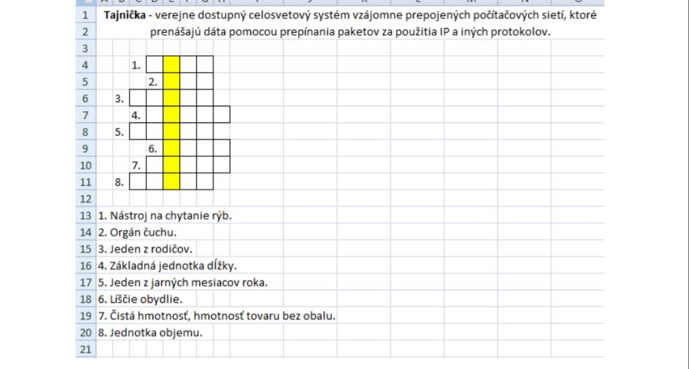 Kde v strede je hádané slovo a po jednotlivých otázok ľudia/deti dopisujú správne odpovede na otázky. Čím teda v strede tajničky vylúštia hádané slovo.